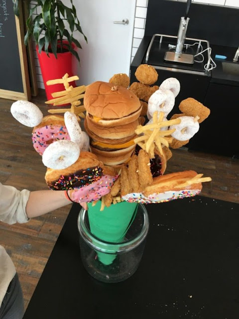 Ramo con comida chatarra y flores ¿Por qué no ambas? Así estarás doblemente encantada y no hay nada más bonito que una novia comida y de buenas.